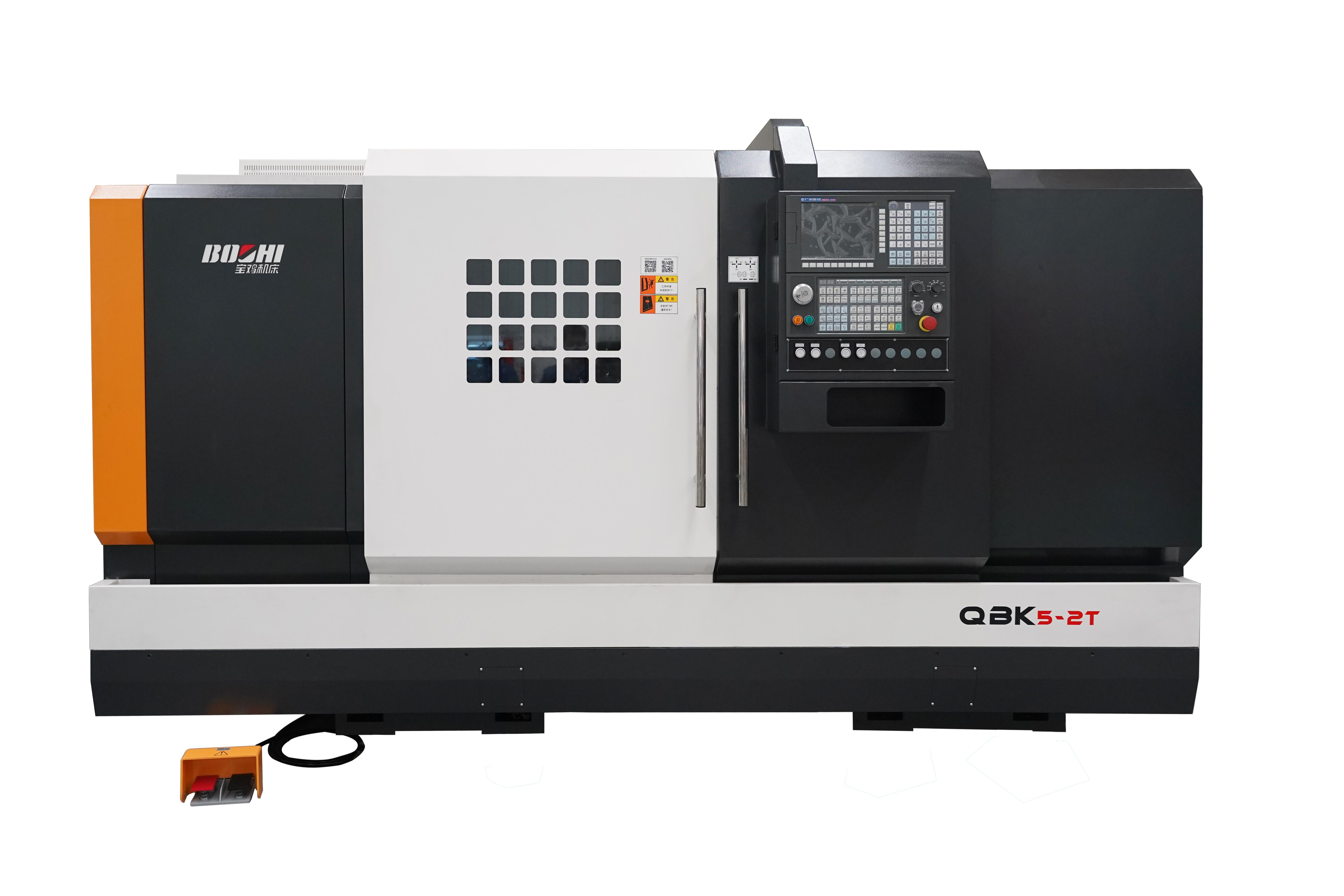 QBK5-2T數(shù)控車床是針對風(fēng)電領(lǐng)域所用緊固螺栓加工而開發(fā)的一款中間驅(qū)動數(shù)控車床,該車床采用兩個(gè)單側(cè)液壓驅(qū)動筒夾夾持工件中部,左右兩側(cè)各配置一組排式刀架,通過兩側(cè)刀具同時(shí)車削,實(shí)現(xiàn)對工件的一次裝夾,完成兩端外圓、端面的高效加工。為適用不同長度工件加工需求,兩側(cè)夾頭間距可通過程序控制實(shí)現(xiàn)自動調(diào)整,方便快捷。